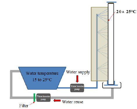 The reuse of the water during the test was important for water conservation. Each test consisted of 10 heating and cooling cycles, with an estimated consumption of 300 liters of water/cycle/specimen, the vertical system was 1.20 ± 0.20m wide by 2.50m high, totaling consumption of 3,000 liters of water per test. Figure 2 shows the water flow diagram for cooling the specimen, using a booster pump and filter, used to prevent clogging of the water spray nozzles.