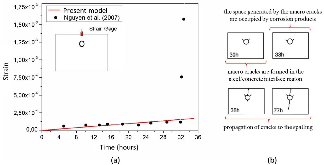 Figure 7.a shows that the numerical results consistently represent the experimental evaluation of the concrete expansion due to uniform corrosion, presenting an average absolute deviation of 4.12%. Notice that, after 30 hours, Nguyen et al. (2007) found a sudden increase in strain, which the numerical model was unable to represent, due to macro cracks formed in the interface of steel and concrete - see Figure 7.b. This behavior cannot be simulated by the proposed model since only elastic strains are considered so far.