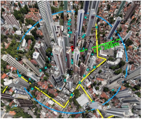Foi adotada a região da zona norte do Recife, entre os bairros de Parnamirim, Tamarineira e Casa Amarela, conforme linhas divisórias em amarelo, definiu-se um círculo azul de raio = 300m de cor verde, utilizando-se do programa de computador Google Earth Pro, Figura 1.