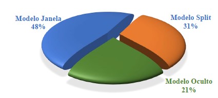 Deste modo, constatou-se que 48% das edificações utilizam modelos tipo janela, 21% com o modelo oculto e por fim, com apenas 31% os modelos que se integram as estruturas das edificações (aparelhos split), estas por sinal são advindas de projetos mais recentes.