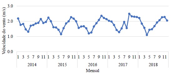 INMET - Instituto Nacional de Meteorologia (2018). “BDMEP - Banco de Dados Meteorológicos para Ensino e Pesquisa - Série Histórica - Dados Mensais - Velocidade do Vento Média (mps)”. Brasília. Disponível em: http://www.inmet.gov.br/portal/index.php?r=bdmep/bdmep. Acesso em: 24/06/2019.