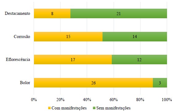 As manifestações patológicas mais encontradas foram: bolor, eflorescência, corrosão da armadura e destacamento do concreto, respectivamente.