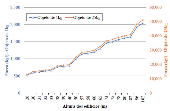 Aproveitando o cálculo demonstrado por (Silveira, 2011), adotou-se para um objeto de 1kg, considerando a quebra parcial de um suporte e outro com peso estimado em 25kg para um completo, em uma situação de desprendimento das fachadas dos edifícios pesquisados e suas respectivas alturas.