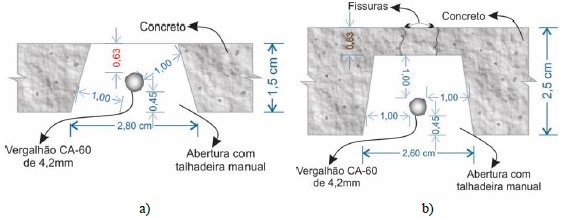 | Figura 12. Corrosão da armadura em modelo tipo janela: a) fissuras; b) destacamento do concreto | ||||