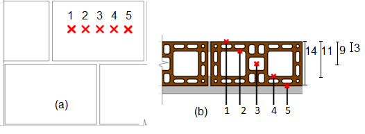 Para evaluar la temperatura de la pared durante el ensayo, se utilizaron 5 termopares en la parte expuesta al fuego y 5 termopares en la parte no expuesta al fuego, fijados en esta superficie, como se muestra en la Figura 2. También se agregaron cinco termopares a lo largo del corte del bloque. como se muestra en la Figura 3.