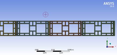 Para la elaboración del modelo computacional, se utilizó el programa Ansys Mechanical Transient Thermal. En este programa, se generó una malla de elementos, como se muestra en la Figura 5. Cada división contenida en la sección de ladrillo representa un elemento finito a calcular, de modo que el programa realiza una serie de cálculos más pequeños y los agrupa para presentar el resultado final.