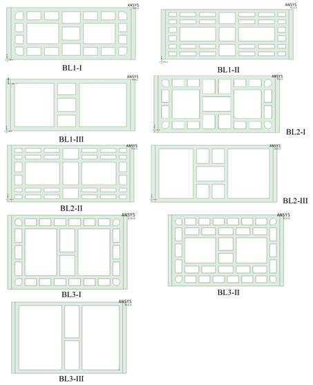 La familia de ladrillos de 11.5 cm de espesor se llamaba BL1; de 14 cm de grosor BL2; y el 19 cm de grosor BL3. Las variaciones porcentuales de huecos (vacíos) dentro de la misma familia de ladrillos se calcularon utilizando la relación entre el área bruta y el área neta, y se refirieron a los índices I, II y III. La Figura 9 detalla los ladrillos utilizados en este estudio. Los ladrillos se nombraron secuencialmente de BL1 a BL3. Se observa que los ladrillos con índices de II (BL1-II, BL2-II y BL3-II) se encuentran en el mercado, los comerciales. A partir de ahí, se propusieron ladrillos con alvéolos más pequeños y ligeramente más grandes, aquellos con índice I (BL1-I, BL2-I y BL3-I), y ladrillos con alvéolos grandes y pequeños, aquellos con índice III (BL1-III), BL2-III y BL3-III).
