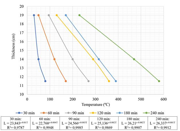 Las isotermas de los ladrillos en el programa computacional se calcularon a los 30, 60, 90, 120, 180 y 240 minutos. Para definir el tiempo de resistencia al fuego (TRF) de cada ladrillo, la temperatura límite de 200ºC (180 + 20 ° C) en la cara no expuesta al fuego se definió para un termopar aislado, basado en los preceptos de NBR 10636 (ABNT, 1989).