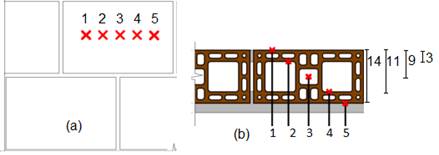 To evaluate the wall temperature throughout the test, five thermocouples were used in the face exposed to the fire and five thermocouples in the unexposed face, placed in its surface, as shown in Figure 2. Also, five thermocouples were added along the block section, as shown in Figure 3.
