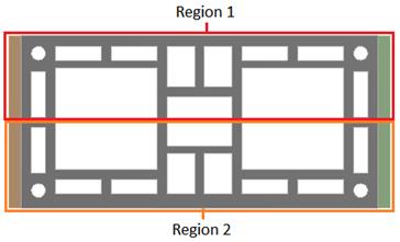 For the definition of the convection values, considering its variability with the increase in temperature, the block was divided into two regions, as shown in Figure 6, and for each one of them a thermal conductivity coefficient value was assigned according to the evolution of the test time, when temperatures rose. The coefficients used are shown in Table 2.