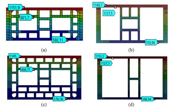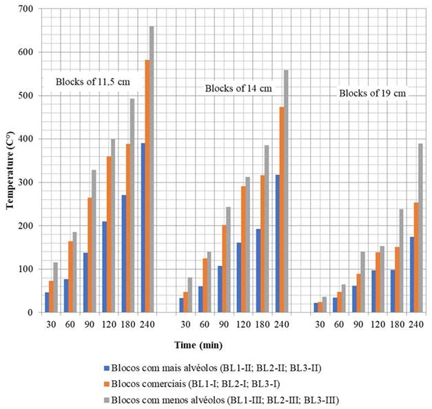 According to Figure 11, it is possible to determine that the alveoli have a great influence on the thermal insulation of the blocks, especially at higher temperatures. It was observed that choosing a block with a larger number of alveoli may be a more effective option, rather than choosing a thicker block, when high FRT is desired, which corroborates with what was concluded by Lee (2017), as to the fact that the influence of the alveoli in a block becomes practically null at low temperatures. Considering the response of the models, it was found that, at higher temperatures, the convective and irradiative phenomena that occur inside the blocks are more relevant than the thermal conduction, which occurs through the material. This is stressed in NBR 15220 (ABNT, 2003), where it defines confined air as an excellent thermal insulator.