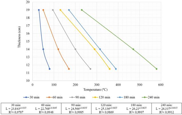Due to the predominant criterion of FRT definition being the temperature of the unexposed face of the block, these measurements were used for the analysis, with the limit temperature of 200 °C on the unexposed face. Block isotherms were collected in the computational program at 30, 60, 90, 120, 180 and 240 minutes. Figure 10 presents the isotherms of some of the blocks used in this study and Figure 11 displays the comparison among all the blocks, with variation in geometry, percentage of voids and thicknesses.