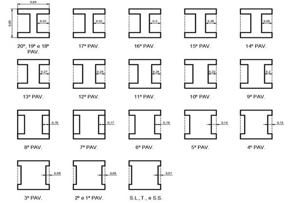 Under a hard work of research to obtain the information and design sheets of the building, some architectural sheets describing the geometry of the columns were found in the records of FAU/USP (Faculty of Architecture of the University of São Paulo). Interestingly and surprisingly the outer section of the columns was square and constant with 85cm by side, but its sturdy cross-section with the shape of the letter H was staggered and variable from floor to floor. In addition, two opposing faces defined a “shaft” that was continuous throughout the height of the columns, from the underground floor to the rooftop, as shown in Figure 5. These “shafts” have been designed and constructed for the central air conditioner system.