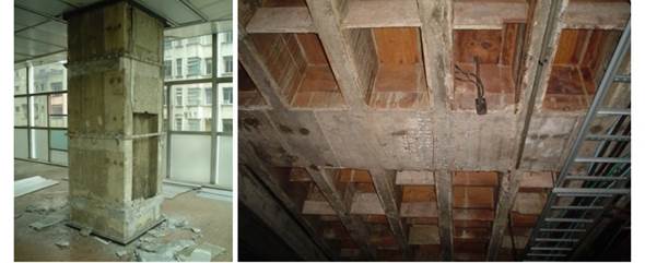 Many adaptations of projects and proposals made during the years of building operation that was headquarters of Federal Police, the Savings Bank and other companies were found in the archives of SPU (Union Heritage Department) together with these sheets. Engineer Leandro Coelho from SPU provided photos of his personal collection taken over the years, where it was possible to confirm, with some degree of precision, the structural typology used in the Wilton Paes de Almeida building (Figure 6).