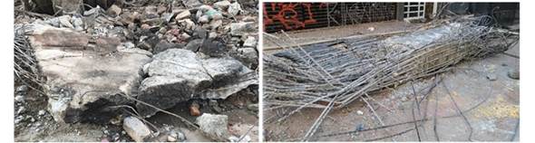 Two major parts of collapsed superstructure were selected for collecting samples of the building to performing characterization tests, one slab portion and one column portion (Figure 10).