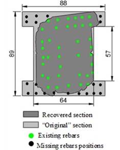 After a diamond wire cutting in the column cross section, the layout of the rebars was evident inside the columns, being possible to make a draft with the reconstitution of column’s cross section sampled, as shown in Figure 11.