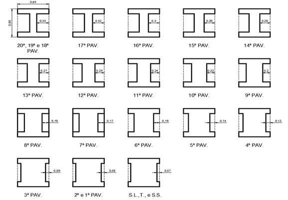 Sob um árduo trabalho de anamnese para obtenção de informações e projetos do edifício, foram encontrados nos registros da FAU.USP (Faculdade de Arquitetura da Universidade de São Paulo) algumas plantas arquitetônicas que descrevem a geometria dos pilares. Curiosa e surpreendentemente a seção exterior dos pilares era quadrada e constante com 85cm de lado, porém sua seção transversal resistente com forma da letra H, era escalonada e variável de andar a andar. Além disso, duas faces opostas definiam um “shaft” que era contínuo em toda a altura do pilar, do subsolo à cobertura, conforme apresentado na Figura 5. Esses “shafts” foram projetados e construídos para circulação do ar condicionado central.