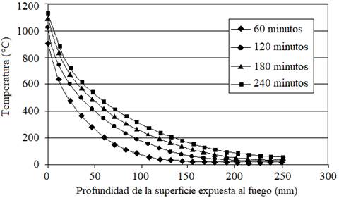 Otra forma de visualizar la evolución de la temperatura en el interior de un elemento de concreto, prescrita por los principales códigos internacionales, se puede ver en la Figura 7. En este caso, se presentan las curvas instantáneas de tiempos estandarizados en función de la temperatura y la profundidad de la superficie expuesta al fuego, modelo de presentación muy común adoptado por investigadores y en los códigos de varios países.