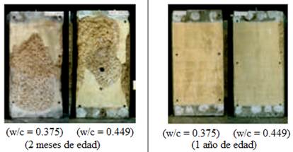 En la Figura 14 es posible observar la considerable diferencia en función de la edad del elemento de concreto para valores equivalentes de relación agua / cemento (ejemplo para: a/c = 0.375 y a/c = 0.449).