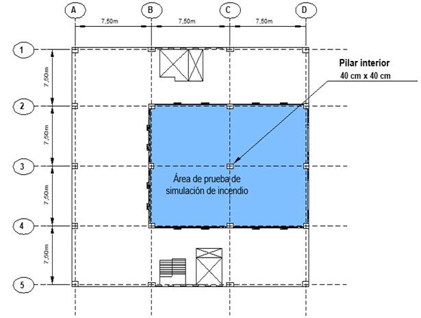 | Figura 17. Plan prototipo de estructura de concreto armado que indica el área bajo simulación de fuego (Chana & Price, 2003). | ||||