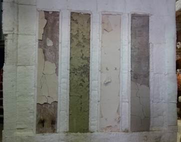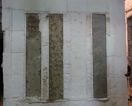 The smooth formulated plaster sample still had some coating remaining upon the furnace opening (without any integrity or adhesion), an amount of 46% of the total area exposed to the fire. For the cement-based mortar sample, this number was 41%. Carefully investigating the elements using a hammer, it was found that the remaining coatings of smooth formulated plaster and mortar were completely friable and the remaining part almost spontaneously displaced, however, the roughcast mortar applied as adhesion was intact in both elements.