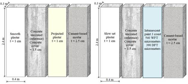 Both the hand applied plaster and the projected plaster were applied with a thickness of 1.0 cm, controlled using a digital caliper and a thickness jig. The intumescent paint was applied in three coats totaling a wet thickness of 540 micrometers, term internationally known as WFT (Wet Film Thickness), which corresponds to 390 micrometers dry thickness, term known as DFT (Dry Film Thickness).