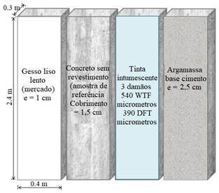 Tanto o gesso liso quanto o gesso projetado foram aplicados com espessura de 1,0 cm, controlada com uso de gabarito e paquímetro digital. A tinta intumescente foi aplicada em três demãos totalizando uma espessura úmida de 540 micrometros, termo internacionalmente conhecido como WFT (Wet Film Thickness), o que corresponde a 390 micrometros de espessura seca, termo conhecido como DFT (Dry Film Thickness).