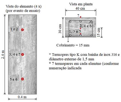 Além disso, foi analisada (principalmente) a capacidade protetiva do revestimento e de seu isolamento por meio da evolução de temperaturas no interior do elemento de concreto, que foi monitorada por meio de sete termopares por elemento (total de 28 termopares por ensaio), instalados estrategicamente na massa de concreto (por elemento, foram seis no interior da massa de concreto e um na sua parte externa, para aferição da capacidade de isolamento de temperatura), conforme exposto nas Figuras 1 e 2. Referência