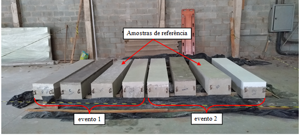 De março de 2018 ao final de agosto de 2018, os elementos foram mantidos descobertos dentro do galpão do IPT, com o intuito de promover a maturidade e grau de hidratação suficientes dos revestimentos, como numa situação normal de obra, conforme Figura 3.