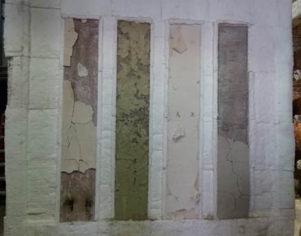 A amostra de gesso formulado liso ainda possuía um revestimento remanescente quando da abertura do forno (sem quaisquer integridade e aderência), equivalente a 46% da área total do elemento com face exposta ao fogo. Para a amostra de argamassa cimentícia, esse número foi de 41%. Apurando-se cuidadosamente os elementos, com uso de um martelo de percussão, percebeu-se que os revestimentos remanescentes de gesso formulado liso manual e de argamassa estavam completamente friáveis e a parte ainda remanescente se desplacou quase que espontaneamente, entretanto, os chapiscos aplicados como ponte de aderência estavam íntegros e intactos.