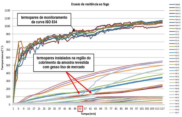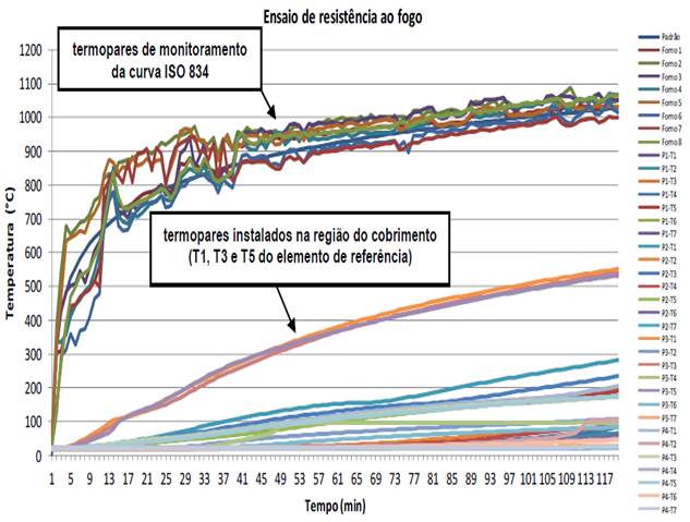 A evolução de temperaturas obtidas no interior das amostras confirmou as análises visuais e qualitativas do desempenho dos revestimentos contrafogo. Conforme observado na Figura 5, a distribuição de calor foi uniforme no interior da amostra, de acordo com a profundidade de cada termopar. Também se nota que os três termopares da amostra de referência na região do cobrimento se diferenciam muito do restante.