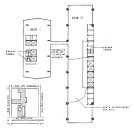 O edifício Sede I apresentava duas escadas não enclausuradas, uma das quais alcançava até o 8º pavimento. O edifício Sede II apresentava apenas uma escada, que era não enclausurada.