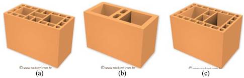 | Figura 1. Blocos estruturais cerâmicos utilizados. (a) B1. (b) B2. (c) B3. (Fonte: <http://www.pauluzzi.com.br/produtos.php>) | ||||