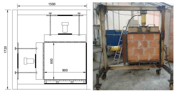 As amostras foram acomodadas para o ensaio dentro de um pórtico de carregamento planejado para resistir aos esforços aplicados e impedir as expansões laterais. Este também foi dimensionado para permitir a aplicação de carregamento vertical distribuído, a fim de simular o carregamento de uma parede estrutural. Trata-se de um quadro feito com perfis de trilhos ferroviários, com dois macacos hidráulicos a ele acoplados: um para aplicação do carregamento vertical e outro para o confinamento lateral. Ambos os macacos foram atrelados a células de carga, para monitoramento dos incrementos sofridos. O esforço realizado pelos macacos foi distribuído nas faces das paredes por meio de perfis metálicos. O desenho esquemático do equipamento planejado e após montado pode ser visto na Figura 2.