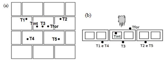 | Figura 3. Posição dos termopares nas amostras. (a) Vista frontal. (b) Vista superior. | ||||