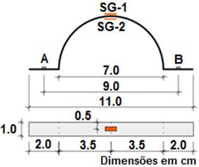 Por meio de transdutores de deslocamento, ou clip-gages, posicionados na face não exposta de um bloco na região central das miniparedes, foram medidas as deformações horizontais e verticais durante o aquecimento. Estes dispositivos foram confeccionados com base no que foi utilizado por Beber (2003), e consistem em arcos dotados de extensômetros em suas faces inferior e superior (Figura 4). Esses arcos são fixados à superfície cujos deslocamentos se desejam medir e, então, a deformação específica determinada pelos extensômetros na seção central dos arcos é correlacionada aos deslocamentos relativos entre os pontos A e B fixados.