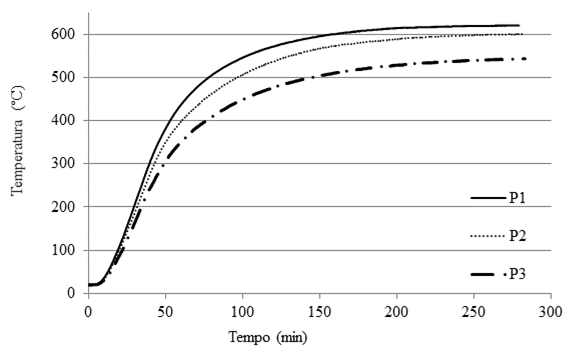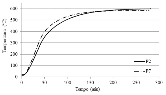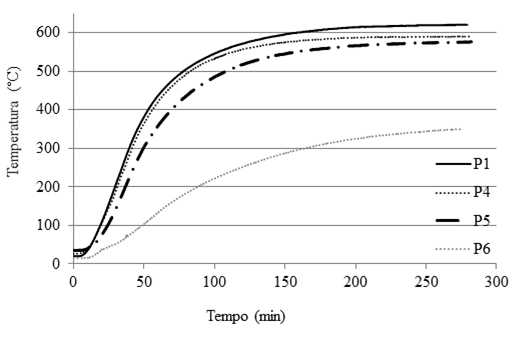 Quando se comparam as amostras da segunda etapa, observa-se pela Figura 6 que a espessura das juntas e a resistência de suas argamassas não exercem influência na transferência de calor, apresentando as paredes P1, P4 e P5 temperaturas no interior dos blocos em torno de 600°C. Ao ser adicionado revestimento na face exposta, no entanto, a redução de temperatura é significativa, atingindo menos de 400°C para as paredes P6.