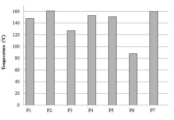 As máximas temperaturas registradas na face oposta à exposição ao calor estão representadas pela Figura 8. Os valores, em geral, se mantiveram em torno de 140 a 160ºC. As exceções ficam por conta da amostra P3, executada com o bloco B3, de maior espessura, e P6, dotada de revestimento em sua face exposta. As últimas mantiveram temperaturas abaixo de 90ºC, evidenciando, novamente, o isolamento que o revestimento proporciona ao elemento, mesmo que aplicado somente em uma de suas faces. Tais resultados corroboram os dados obtidos por Nguyen e Meftah (2012) e por Souza (2017), que, similarmente, encontraram temperaturas expressivamente inferiores em alvenarias com faces revestidas. Os primeiros, por sua vez, também identificaram alguma influência do aumento da espessura do bloco no isolamento térmico da alvenaria. Conforme esperado, as resistências dos blocos e as juntas de assentamento não exercem influência significativa nos resultados de temperatura das alvenarias ensaiadas.