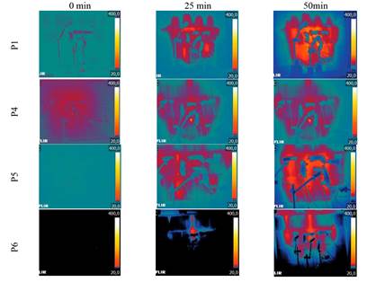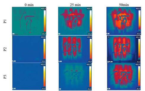 A diferença de coloração e, portanto, de temperatura que pode ser visualizada entre as primeiras imagens (tempo 0 min) de cada figura é remetida às diferentes temperaturas ambiente nos dias dos ensaios, que variam muito ao longo do ano na região onde os mesmos foram realizados.