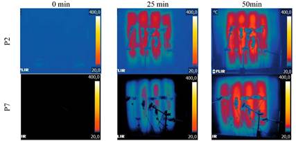 Também se visualiza um diferente padrão de aquecimento das amostras P2 e P7, executadas com blocos do tipo B2, de resistência 10 MPa, em que a temperatura se propaga essencialmente pelas cavidades dos mesmos (Figura 11). O padrão é semelhante ao observado por Nguyen e Meftah (2012), que identificaram temperaturas superiores nos alvéolos dos blocos. Segundo os autores, em uma parede os principais mecanismos de transferência de calor são convecção e irradiação, assim, as temperaturas medidas nas cavidades dos blocos são maiores do que as medidas nas suas paredes transversais, onde o calor é propagado por condução. Isso posto, o padrão observado ocorre devido ao fato de as paredes dessas unidades serem maciças e, portanto, a propagação do calor ser menor nessas regiões do que nos blocos de paredes vazadas.