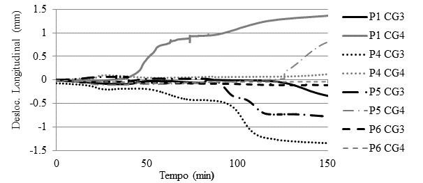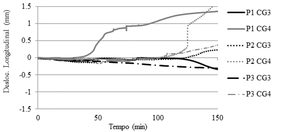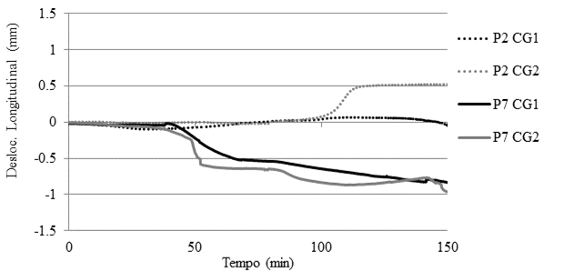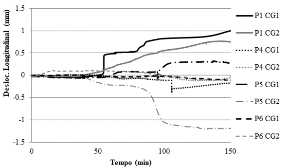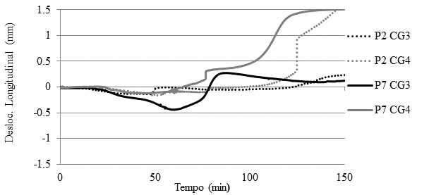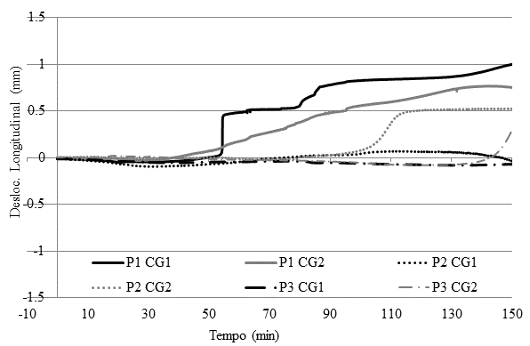 Uma das observações que pode ser feita por meio dos resultados apresentados é de que amostras com juntas mais flexíveis tendem a permitir a dilatação do bloco, formando um sistema mais deformável em comparação aos demais. Esse comportamento pode ser observado na amostra P1, por exemplo, onde os transdutores fixados ao bloco central - CG 1 e CG 2 - apresentaram comportamento que indica expansão em ambas as direções (Figura 12). O início da dilatação coincide com o momento em que a temperatura na face externa começa a se elevar.