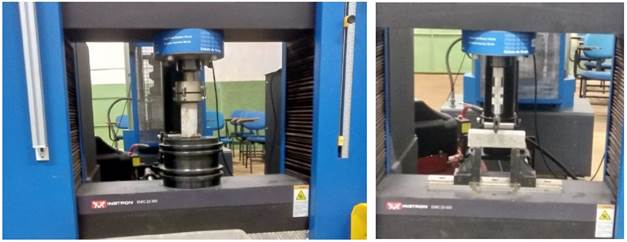 The compressive strength test was performed with cylindrical specimens according to the NBR 7215 standard (ABNT, 2019), while the flexural tensile strength test was performed according to the NBR 13279 standard (ABNT, 2005), using prismatic test pieces, both under a hydraulic press, as shown in Figure 4.