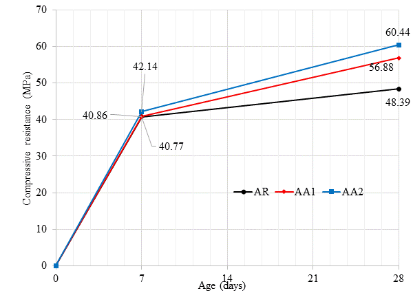 The tests were carried out according to Figure 2, and the traces were defined according to Table 6, with a reference mixture (AR) without additive and two mixtures (AA1 and AA2) containing 1% and 2% crystallizing admixture contents. During the mixture production mixtures, the admixture was previously diluted in the mixing water, as specified by the manufacturer.