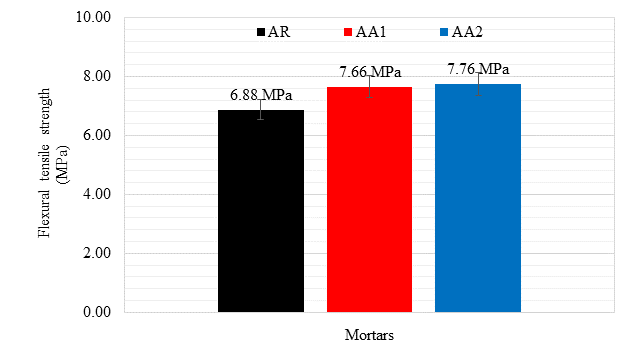 | Figure 7. Flexural tensile strength tests (MPa) results of the evaluated mortars. | ||||