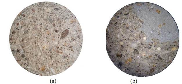 | Figure 8. Microscopic image of the cross section of the specimen without the admixture (a) and containing 2% of the admixture (b), both after rupture at 28 days. Images under 35x magnification. | ||||