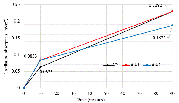 The higher the admixture content, the lower the capillarity coefficient and, consequently, the lower the capillarity absorption for a fraction of time. As in the previous data, the AA2 mixture presented the best results, reaching a coefficient about 37.5% lower than the RA, while AA1 reached a reduction of 12.7% compared to the RA.