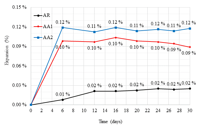 The differences between mortar variations are significant, where AA2 underwent an initial expansion at 6 days about 1100% higher than RA, while AA1 exhibited a 900% increase in expansion compared to RA. However, after this 6-day period, expansion ceased, specimen dimensions stabilized and, consequently, percentage expansions decreased as a function of time, to 500% and 350%, respectively.