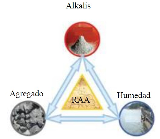 El RAA es uno de los fenómenos patológicos que más atacan las estructuras de composición del cemento y uno de los más relevantes en cuanto a la durabilidad. En resumen, se puede definir como reacciones químicas entre algunos componentes del agregado con los hidróxidos alcalinos presentes en los poros de la matriz del cemento. Estas reacciones no tienen un tiempo preestablecido para su aparición, una vez que están vinculadas a varios factores, como, por ejemplo: la cantidad de álcali susceptible de reacción en la matriz; la temperatura y la humedad del local; la reactividad del agregado; y, por fin, la naturaleza del material, como presentado en la Figura 1 (Silva, 2007).