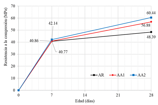 A los siete días es posible observar una aproximación de los resultados de resistencia de las tres mezclas. Esto se debe al poco tiempo transcurrido desde la producción de los morteros para la reacción del aditivo, ya que su reactividad depende de las reacciones de hidratación del cemento. Sin embargo, a los 28 días, el incremento de resistencia de las mezclas con aditivo en relación a la mezcla de referencia ya es notorio. El mortero AA2 logró una resistencia de 24,9% superior al AR, mientras que el AA1 alcanzó un valor en torno al 17,5% superior al AR. Como no se modificó ninguna información entre las mezclas que no sea el uso del aditivo, el aumento de resistencia se debe a su uso.