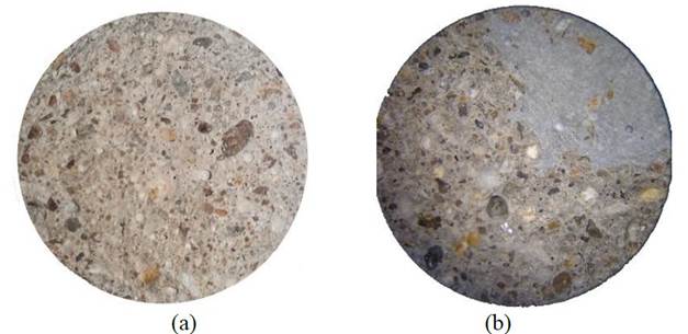 | Figura 8. Imagen microscópica del corte transversal de la probeta sin aditivo (a) y con aditivo al 2% (b), ambos tras la rotura a los 28 días. Imágenes con zoom de aumento de 35x. | ||||